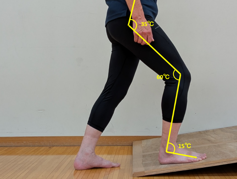 関節可動域とは、関節がどの程度曲がるかを示します。段差の昇降で主に使うのは股関節・膝関節・足関節です。標準的な上がり框を上がるには、股関節65度、膝関節95度、足関節20度の可動域が必要です。また、建築基準法に基づいたスロープを昇降する場合は、股関節35度、膝関節60度、足関節15度が必要になります(写真①、②)。